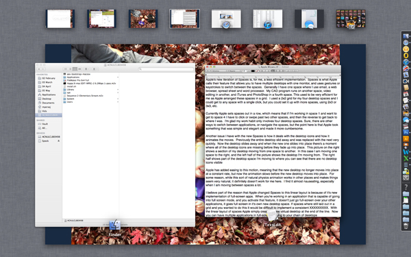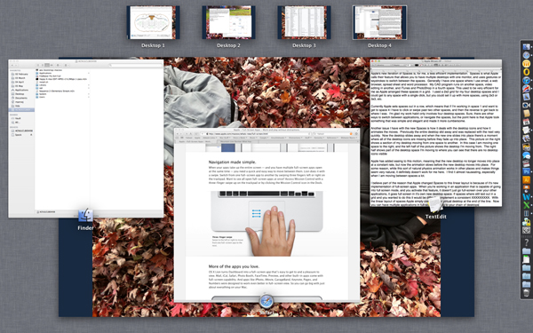 (Update: I’ve realized that the gesture to move from one desktop Space to another is probably another reason why Apple changed the way spaces are laid out.)