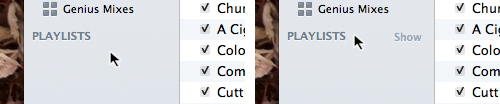 As you can see in this picture above, on the left is what looks like an empty list of Playlists with no indication that there might be some content contained under that heading, and on the right, when the pointer is lined up with the section heading, the word ‘show’ appears. When the playlists are visible, the word ‘hide’ appears when the pointer is in line with the heading. I discovered this functionality quite by accident and after a brief moment of panic when it appeared that all of my playlists had disappeared.