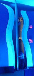 What is hard to see in these pictures is how the top of the set is not a straight line, but instead curves up down like a wave, similar to the white vertical pieces. The screens are also surrounded by pieces that are curvy. This was an attempt to reflect some of the style of Spanish architect Antonio Gaudi with the set.