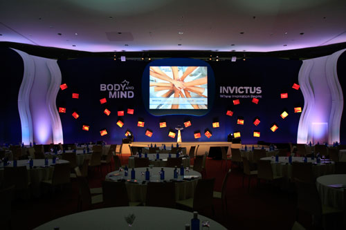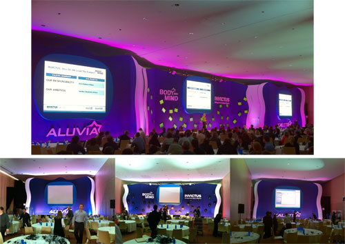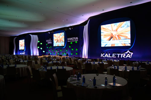 The white vertical panels flanking the stage served a second purpose for us – in addition to adding some more curves to the set, these panels also could be removed to allow the ballroom airwalls to pass through the set so that the room could be divided into sections. The way that the meetings were timed, we had a total of 30 minutes to get everyone out of the room, split it into sections, and set the three separate rooms so that they could run independently with audio and video for their own meetings. We then had 30 minutes to reverse the process and combine the three rooms back into one meeting room.