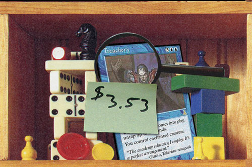 This was a tough one – how do you represent something this abstract? The card is called Treachery, and I tried to make that more obvious by putting the magnifier in front of it. I don’t think it was really legible in the final artwork, but I guess it satisfied me enough to go with it.