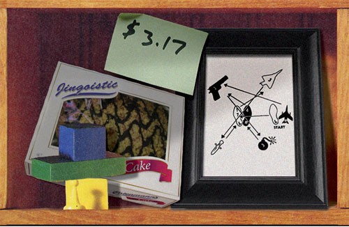 A second item in this cubicle is the Jingoistic Cake. That was almost the title of this CD, but it didn’t seem like it would be as much fun for an album cover, but I wanted to put it here anyway. The cake box is from a Brooklyn based bakery, Entenmann’s, which is pretty well known on the east coast. I think I matched the brand name style well enough that people would’t notice the change at first glance.