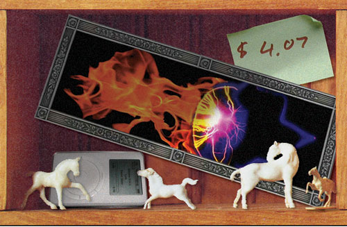 I like this clue. It’s not too obvious, but the head on fire, I think, gets the point across. Bonus extra in this one: The iPod (a 2nd generation, 10GB firewire, in case you’re interested) is showing the name and artist of the hidden track on the CD. It’s not really legible in the final artwork, but it’s there. Here’s a close up and the original pic.