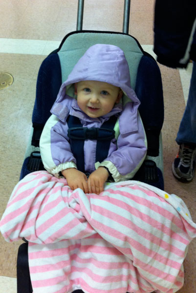 Our oldest had an evening of parent-teaher conferences, and the little girl was having fun while her brothers pushed her aound the school hallways.